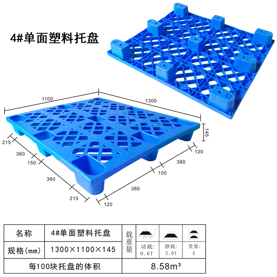 | Color | Low blue,blue,yellow,black,green,red,white,grey,other | Dynamic load | 0.6T | Material | PP,PE | Model | Four-way | Scope | Food pharmaceutical and chemical industries such as textile parts factory warehouse logistics transportation | size | 1300×1100×145 | Static load | 2T | Type | Single side | 100 volume | 8.58m3 | Shelf | X |
