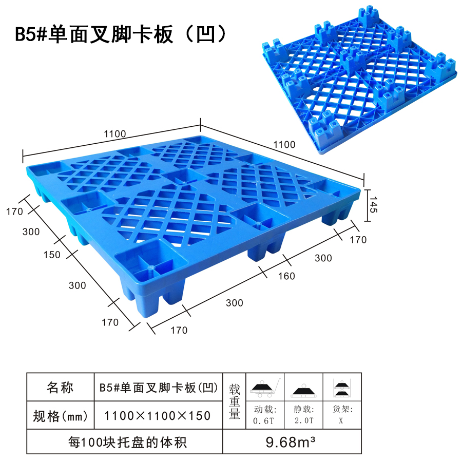 | Color | Low blue,blue,yellow,black,green,red,white,grey,other | Dynamic load | 0.6T | Material | PP,PE | Model | Four-way | Scope | Food pharmaceutical and chemical industries such as textile parts factory warehouse logistics transportation | size | 1100×1100×145 | Static load | 2T | Type | Single side | 100 volume | 9.68m3 | Shelf | X |