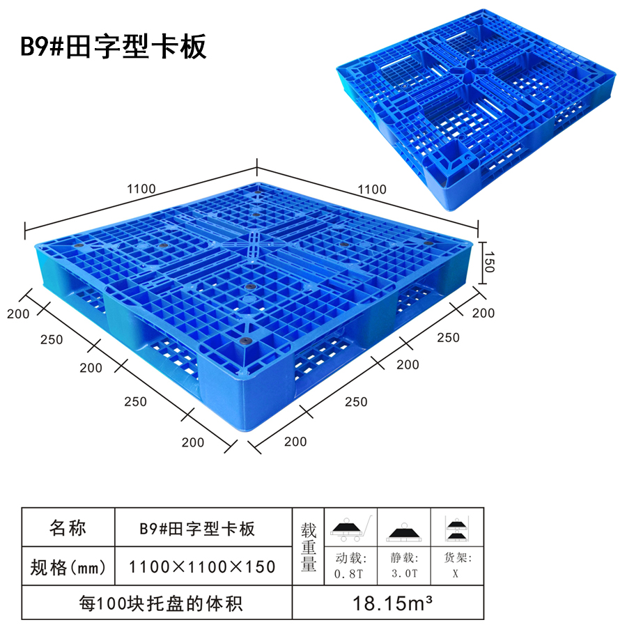 | Color | Low blue,blue,yellow,black,green,red,white,grey,other | Dynamic load | 0.8T | Material | PP,PE | Model | Four-way | Scope | Container, stacking, handling and transport of goods placed, import and export trade, warehousing and logistics | size | 1100×1100×150 | Static load | 3T | Type | Tian word | 100 volume | 18.15m3 | Shelf | X |