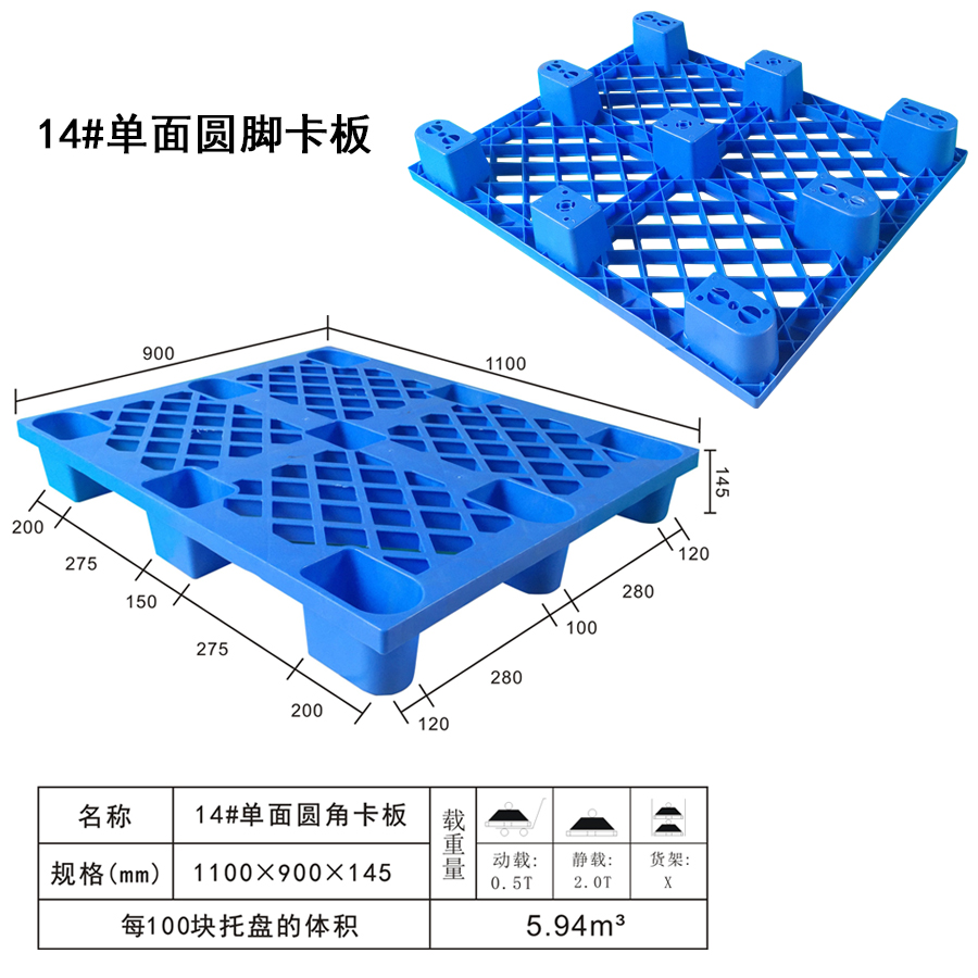 | Color | Low blue,blue,yellow,black,green,red,white,grey,other | Dynamic load | 0.5T | Material | PP,PE | Model | Four-way | Scope | Food pharmaceutical and chemical industries such as textile parts factory warehouse logistics transportation | size | 1100×900×145 | Static load | 2T | Type | Single side | 100 volume | 6m3 | Shelf | X |