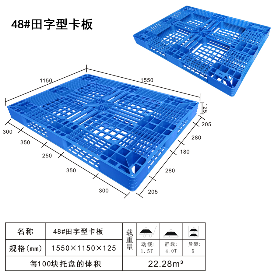 | Color | Low blue,blue,yellow,black,green,red,white,grey,other | Dynamic load | 1.5T | Material | PP,PE | Model | Four-way | Scope | Container, stacking, handling and transport of goods placed, import and export trade, warehousing and logistics | size | 1550×1150×125 | Static load | 4T | Type | Tian word | 100 volume | 22.28m3 | Shelf | X |