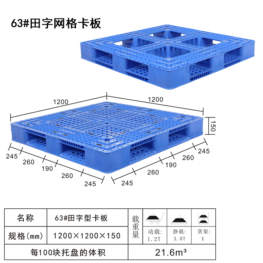| Color | Low blue,blue,yellow,black,green,red,white,grey,other | Dynamic load | 1.2T | Material | PP,PE | Model | Four-way | Scope | Container, stacking, handling and transport of goods placed, import and export trade, warehousing and logistics. | size | 1200×1200×150 | Static load | 3T | Type | Tian word | 100 volume | 21.6m3 | Shelf | X |