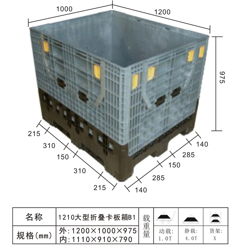 | 可選顏色 | 低蘭,蘭,黃,黑,綠,紅,白,灰,其他 | 動載 | 1T | 材料 | PP,PE | 型式 | 四面進叉 | 適用范圍 | 各種零部件和原料的包裝,儲存和運輸 | 尺寸 | 1200x1000x975 | 靜載 | 4T | 類型 | 周轉箱 | 百個數量體積 | -- | 貨架 | -- |