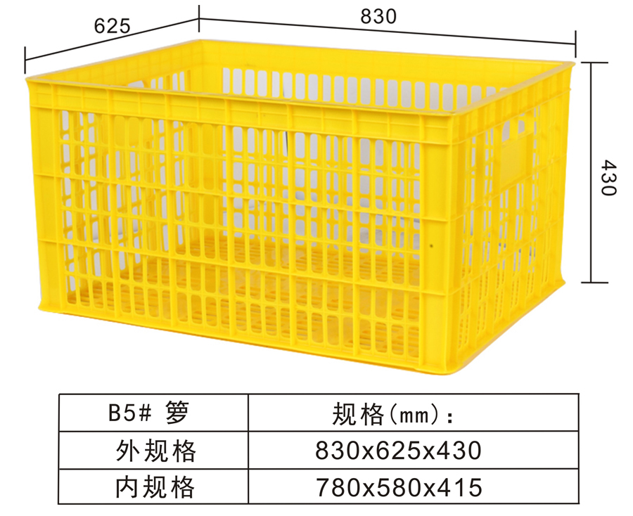| Color | Low blue,blue,yellow,black,green,red,white,grey,other | Dynamic load | -- | Material | PP,PE | Model | -- | Scope | Fruits, vegetables, machinery parts, refrigeration, storage, transportation and other industries | size | 830×625×430 | Static load | -- | Type | Turnover basket | 100 volume | 22m3 | Shelf | -- |