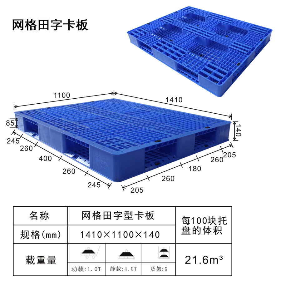 | Color | Low blue,blue,yellow,black,green,red,white,grey,other | Dynamic load | 1T | Material | PP,PE | Model | Four-way | Scope | Special tray for chemical plant, beverage factory and brewery | size | 1400×1100×140 | Static load | 4T | Type | Tian word | 100 volume | 21.6m3 | Shelf | X |